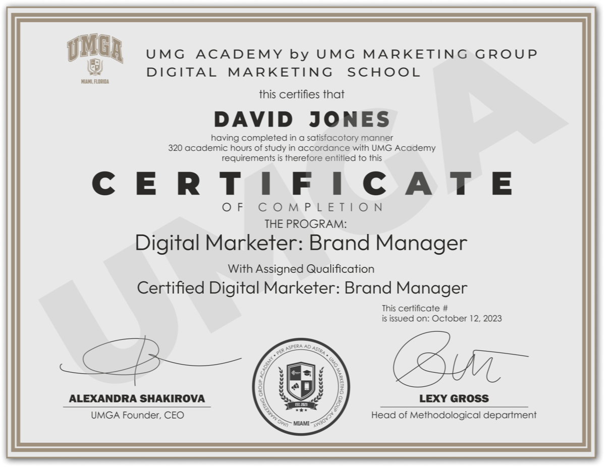 Профессиональный сертификат специалиста от UMG Academy подтверждает, что вы полностью прослушали и усвоили программу, разработанную международными экспертами и маркетологами UMG Marketing Group.